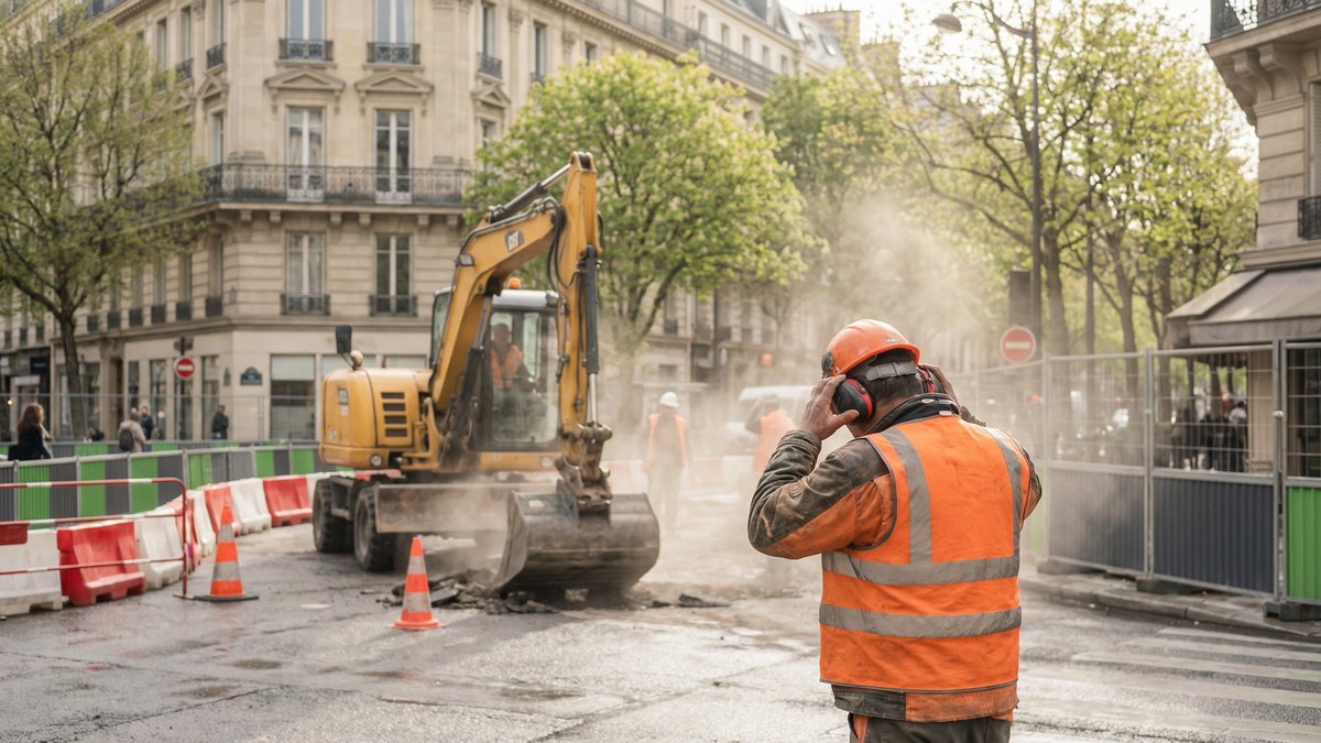 - un fond sonore permanent (engins, marteaux‑piqueurs, camions, scies, alarmes de recul) qui dépasse facilement les 85 dB(A)